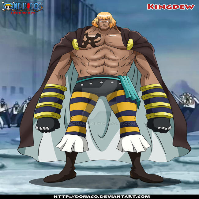 This is a picture of Kingdew, a fictional character with an iron body and a tattoo on his right chest from the manga One Piece.