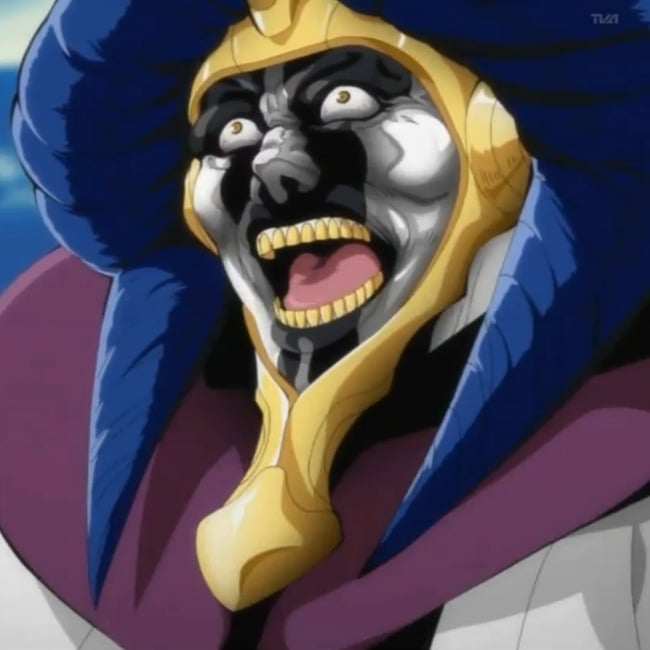 This is a photo of Kurotsuchi Mayuri, a fictional character, the current captain of Team 12 and the director of the Shinigami Research and Development Institute after Urahara Kisuke in the Bleach manga. Mayuri's appearance resembles a skeleton with a skull-like image. His face is painted completely in white with the inside of his face painted black, except for the nose.